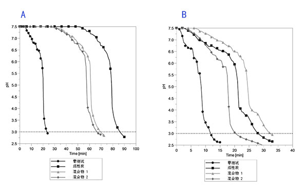 圖1a顯示了在上述的試驗(yàn)結(jié)果?梢钥闯,在22分鐘后,氣體洗滌瓶中的pH值降至3以下,而在反應(yīng)器中不使用活性炭吸附劑樣品。用活化的氧化鋁樣品裝載反應(yīng)器分別產(chǎn)生66和71分鐘的穿透時(shí)間。用浸漬的活性炭實(shí)現(xiàn)了最佳性能,即氯化氫吸附容量為0.0288g/g。將氣體流速提高所取得的結(jié)果如圖1b所示。要進(jìn)行的第一次試驗(yàn)是在反應(yīng)器中沒(méi)有活性炭吸附劑負(fù)載,并且在12分鐘后氣體洗滌瓶中去離子水的pH值降至3以下。對(duì)于浸漬的活性炭,氯化氫吸附容量從0.0288g/g降低至0.0172g/g。