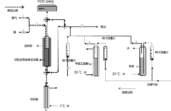 在稱(chēng)重后將活性炭重新安裝到反應(yīng)器中。然后將閥門(mén)切換到解吸過(guò)程。將冷卻器的溫度設(shè)定為5℃,并加熱加熱帶直至達(dá)到解吸介質(zhì)的所需溫度(100℃或130℃)。解吸時(shí)間為10分鐘。當(dāng)反應(yīng)器的中心達(dá)到約35℃時(shí),將解吸介質(zhì)引入反應(yīng)器中。然后收集解吸的溶劑。當(dāng)滿(mǎn)足設(shè)定的解吸時(shí)間時(shí),終止加熱和解吸介質(zhì)并且溫度開(kāi)始下降。此后,將吹掃的壓縮空氣注入(在某些實(shí)驗(yàn)測(cè)試中使用氮?dú)?到反應(yīng)器中,直到中心溫度降至室溫。收集解吸的溶劑并稱(chēng)重用于計(jì)算活性炭的工作容量。工作容量定義為吹掃后飽和VOC吸附容量與碳上殘余VOC的差值。然后使用氣相色譜儀分析溶劑的組成。