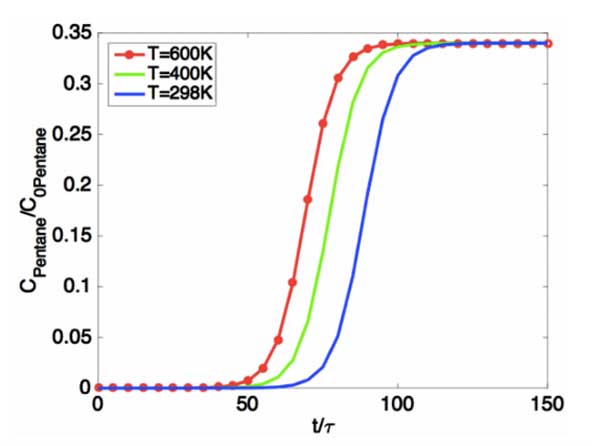 結(jié)果與討論我們已經(jīng)提出了一個(gè)綜合模型,該模型定量地預(yù)測(cè)了填充床反應(yīng)器中油蒸氣回收的吸附動(dòng)力學(xué)。在該模型中,我們僅考慮軸向擴(kuò)散,并使用質(zhì)量守恒方程來模擬油氣吸附的時(shí)空分布。我們假設(shè)活性炭吸附在恒溫下操作,并且與活性炭的吸附容量相比,油蒸氣濃度非常低。此外,假設(shè)油蒸氣中的組分之間不發(fā)生化學(xué)反應(yīng),因此每種組分可以作為獨(dú)立的吸附物處理。因此,多組分吸附問題可以轉(zhuǎn)化為單組分吸附問題。下圖(圖2)說明了吸附動(dòng)力學(xué)的溫度依賴性。