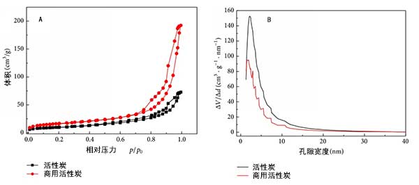 圖3:活性炭和商業(yè)活性炭的N2吸附-解吸等溫線(a)和孔徑分布曲線(b)。