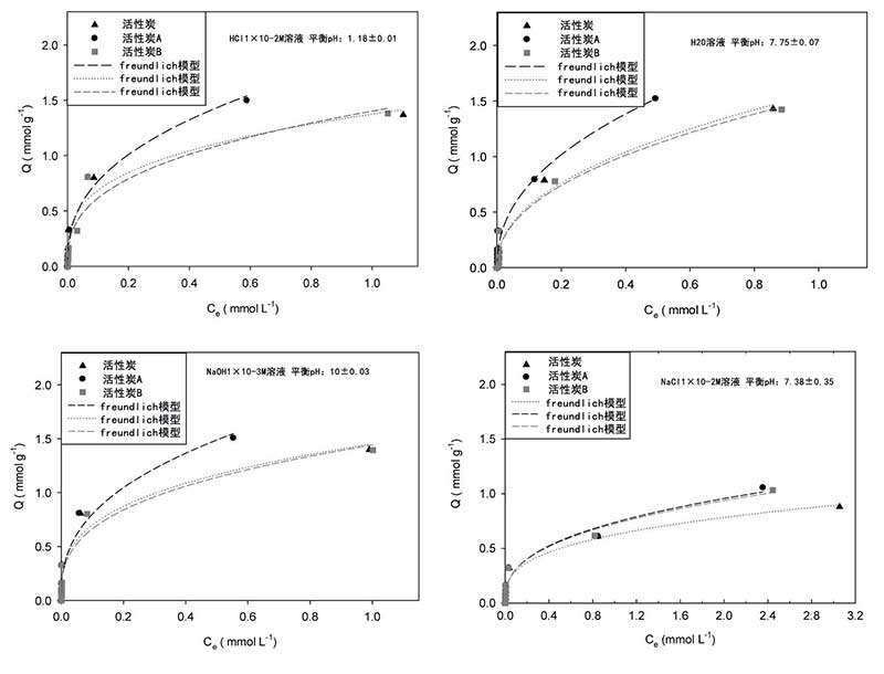 從圖3可以看出,在所有測(cè)試的實(shí)驗(yàn)條件下,當(dāng)平衡濃度較低(即<0.1mmol L-1)時(shí),對(duì)羥基苯甲酸甲酯吸附量的差異三種活性炭最小,而對(duì)于較高的平衡濃度,活性炭A表現(xiàn)出最高的性能,活性炭和活性炭B具有相似的行為,除非離子強(qiáng)度發(fā)生變化。事實(shí)上,在后一種情況下,熱處理樣品顯示出最佳性能并且?guī)缀跸嗨。為了詳?xì)分析檢索到的結(jié)果,需要進(jìn)一步調(diào)查,建模分析可能會(huì)有所幫助。