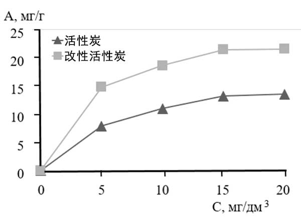 用發(fā)煙硫酸處理活性炭導(dǎo)致磺酸鹽基團(tuán)捕獲吸附劑表面和孔內(nèi)部。用二氯乙烷對活性炭的初級處理有利于磺化劑在孔深度中的滲透,從而增強(qiáng)氧化,并由此促進(jìn)磺酸鹽基團(tuán)的形成?咨疃戎谢撬猁}基團(tuán)的存在增加了吸附劑相對于汞離子的吸附能力。對于改性活性炭在靜態(tài)條件下對汞離子吸附的研究結(jié)果,根據(jù)獲得的實(shí)驗(yàn)數(shù)據(jù),繪制了活性炭和改性活性炭的比較等溫線(圖1)。