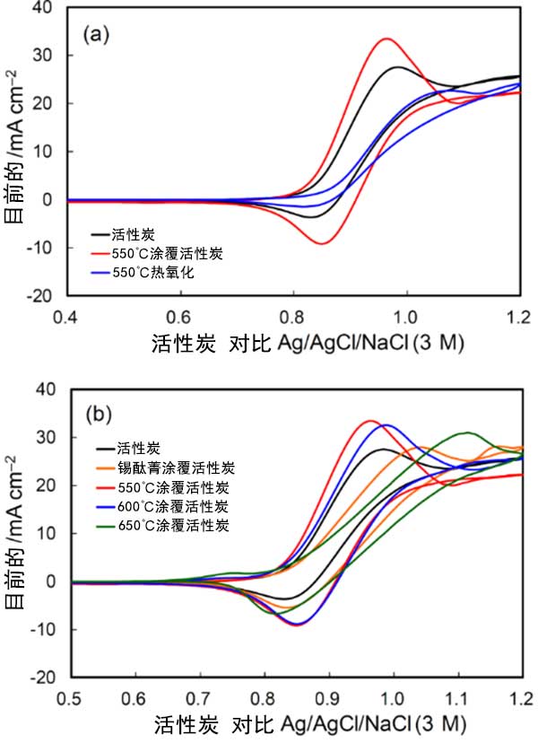 在沒有釩離子的酸性電解質(zhì)中獲得的循環(huán)伏安圖顯示在圖3中。伏安圖中的電流由三個組分組成,即活性炭-電解質(zhì)界面處的電化學雙層充電電流,以及由于表面官能團的氧化還原反應和活性炭表面氧化引起的法拉第電流。電化學雙層充電產(chǎn)生恒定電流和矩形CV形狀。電流取決于基面和邊緣平面的曝光程度,在0.5V附近的寬氧化還原峰和0.8V以上的氧化電流分別歸因于醌/氫醌樣表面官能團的氧化還原反應和活性炭表面氧化。這些電流在熱氧化后增加,并且在錫酞菁涂覆活性炭的熱氧化期間隨著溫度的升高而增加。電化學雙層電流的增加歸因于邊緣平面的暴露,這與拉曼光譜一致。對于錫酞菁涂覆活性炭觀察到的活性炭表面氧化電流意味著高表面粗糙度的發(fā)展。