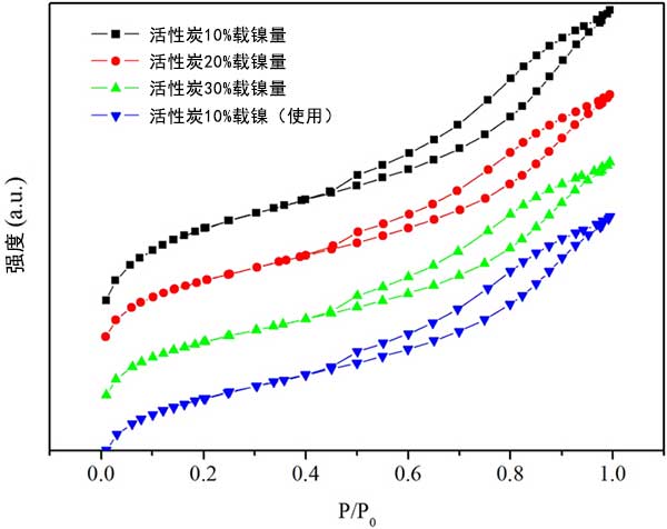 為了研究活性炭載鎳催化劑的可重復(fù)使用性,首先在真空下過濾分離先前實(shí)驗(yàn)的廢活性炭,然后用丙酮徹底洗滌,接著用水洗滌多次。然后將過濾的活性炭在強(qiáng)制通風(fēng)烘箱中在110℃下干燥,然后在管式爐中在氮?dú)饬飨略?00℃下煅燒4小時。經(jīng)過從新活化的活性炭的測試,活性炭對硬脂酸的產(chǎn)率和選擇性轉(zhuǎn)化為十七烷在重復(fù)三次催化后性能幾乎沒有下降。選擇性保持在約90%,在無溶劑體系中保持穩(wěn)定;钚蕴康腘2吸附-脫附等溫線如圖3所示,表明隨著鎳負(fù)載量的增加,活性炭的表面積和孔體積減小,表明過量的鎳顆?赡茏枞欢康幕钚蕴靠撞p少孔體積。