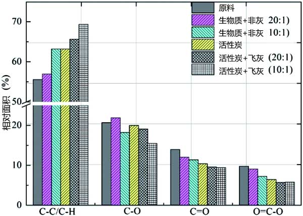表面基團的芳香族C-C或C-H隨著活性炭原料在熱解時的比例增加以及氣體活化而增加可以從圖2中可以看出。這是預期的,在不完全燃燒和部分氧化可導致在含碳材料內(nèi)形成芳族化合物。含氧官能團如C-O,C=O和O.=隨著生物炭和活性炭的煤飛灰比例增加,C-O的相對面積減小。煤飛灰似乎提高了芳構(gòu)化程度,但顯著降低了羰基的相對濃度,同時保持或適度降低了酮和羧酸的性質(zhì)。這可能涉及先前發(fā)現(xiàn)的用于生物質(zhì)和煤飛灰的共熱解的生物燃料的增強的脫氧,并且表明活性炭的表面化學可以使用煤飛灰作為添加劑來介導。