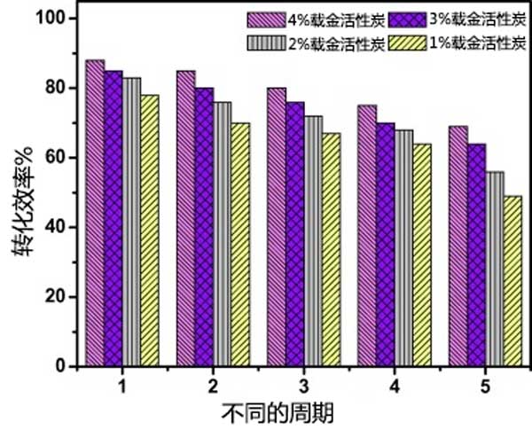 為了量化活性炭載金催化劑的催化活性,可以使用轉(zhuǎn)換頻率作為度量。轉(zhuǎn)換頻率可以定義為使用每克活性炭每單位時間轉(zhuǎn)化成產(chǎn)物(對氨基苯酚)的反應(yīng)物分子(對硝基苯酚)的數(shù)量;钚蕴枯d金催化劑是可回收的,每次運行后,通過離心分離催化劑。即使使用5次,催化劑的轉(zhuǎn)化率最多降10%。這通過繪制百分比轉(zhuǎn)換效率與循環(huán)次數(shù)來顯示,如圖3示。