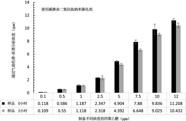 二氧化鈦摻雜的碳催化劑被認(rèn)為對水中的四聚乙醛降解無效,特別是與活性炭相比。圖3示出了前和2小時處理被碳摻雜二氧化鈦后在溶液聚乙醛的濃度2在UV-C光納米催化劑。在較高的初始濃度的金屬醛溶液如5、7.5、10和12ppm時,與較低濃度的降解相比,降解稍微更顯著(2-9%)。