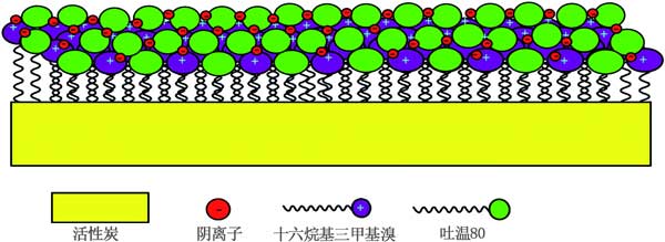 用表面活性劑改性的活性炭在電吸附過程中具有潛在的應(yīng)用,其中表面電荷和潤(rùn)濕性起重要作用。用離子表面活性劑功能化的活性炭電極最近在電容去離子技術(shù),特別是反向電容去離子系統(tǒng)中引起了相當(dāng)大的關(guān)注。圖3表明在用吐溫80和HDTMA的二元混合物改性的活性炭上吸附陰離子。吐溫80的存在表明HDTMA的吸附密度增強(qiáng),完美填充(高穩(wěn)定性),這在電吸附過程中都是值得的。實(shí)際上,HDTMA的增強(qiáng)的吸附密度誘導(dǎo)了陰離子污染物的高吸附能力。此外,改進(jìn)的填料賦予表面活性劑在表面上的穩(wěn)定性。這些特殊效果是混合表面活性劑體系應(yīng)用的最終目標(biāo)之一,為了提高活性炭的表面活性,對(duì)于單一表面活性劑體系來說,這是不可能發(fā)生的。