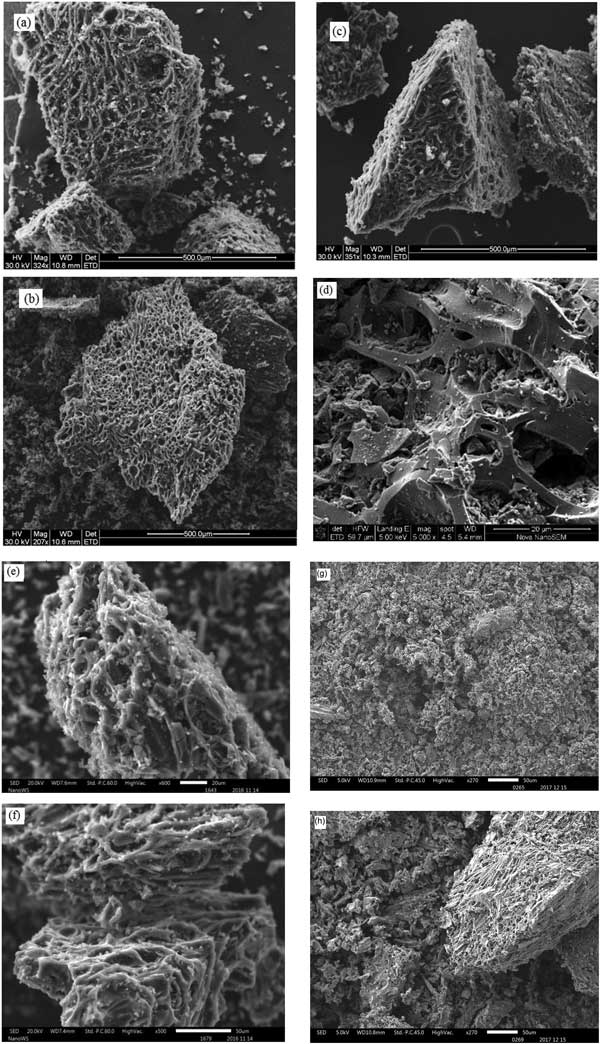 掃描電子顯微鏡圖像顯示在圖1a-h中;钚蕴康牧姿崽幚韺(dǎo)致具有可見孔隙率的材料(圖1a-c)。然而,仔細(xì)觀察后,孔隙結(jié)構(gòu)和尺寸是不同的。20%濃度改性后的活性炭具有稍微細(xì)長(zhǎng)的孔,40%表現(xiàn)出均勻的圓形孔,而60%顯示出細(xì)長(zhǎng)和圓形毛孔的混合。這些觀察結(jié)果表明,不同濃度的磷酸活化的活性炭具有不同的物理屬性。在這種情況下,磷酸是活化劑,并且在加熱時(shí)產(chǎn)生孔道,因?yàn)樗鼜奶贾幸莩,從而帶走一些萃取劑。圖1d描繪了具有小孔的粗糙紋理,圖1e顯示了類似巢的類型的孔,圖1f顯示了孔的破壞和變寬。孔結(jié)構(gòu)和孔體積的變化可歸因于活化劑的強(qiáng)度增加。濃度較高的硝酸會(huì)破壞表面基團(tuán)。因此,需要使用最佳濃度的活化劑來防止損害吸附劑的表面特性。濃度太高可能導(dǎo)致結(jié)合官能團(tuán)的提取,使吸附劑吸附性差。