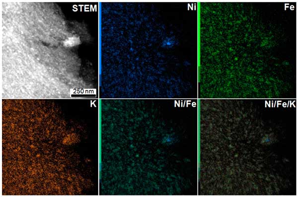 進(jìn)行EDX映射以獲得有關(guān)顆粒的局部化學(xué)組成的更多信息。作為示例,圖2呈現(xiàn)了活性炭載鎳材料的EDX映射。如觀察到的圖2中,鎳和鐵,還鉀的存在下,在該材料檢測。這三種金屬的EDX映射的疊加顯示出完美的匹配,表明納米粒子結(jié)構(gòu)中存在所有這些金屬。除小顆粒外,還觀察到一個(gè)位于碳末端的大顆粒,并且鎳比其他金屬富集。對于活性炭載銅和銦在顆粒結(jié)構(gòu)中也發(fā)現(xiàn)了鉀的存在。