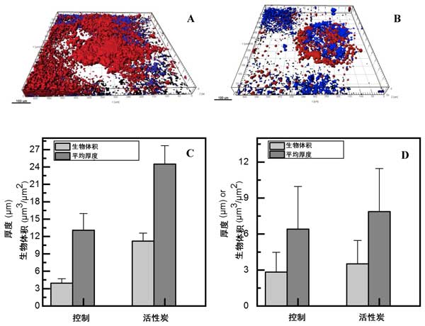 為了分析由于在膜生物反應器中添加活性炭而導致生物膜形成增加的可能性,并進一步闡明活性炭反應器中膜性能下降幅度更大的原因,在第一個處理結束時進行了檢測(圖2A,B)。在比較兩個反應器之間生物膜結構的性質時,可以觀察到活性炭反應器通量下降的增加顯然與生物膜生長的幅度有關。在第一次膜生物反應器運行結束時從模塊上獲取的兩塊膜上生物膜的CLSM分析顯示,活性炭和對照反應器之間細胞的生物體積及其自相關EPS的差異很大(圖2)。當補充活性炭時,生物膜生長的升高支持了膜滲透性的更高降低,這是由可溶性微生物組分吸附的升高引起的,這可能會更好地調節(jié)膜表面,從而增強生物膜的形成。