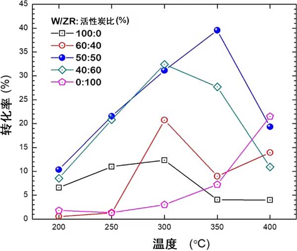 在第一部分中,我們比較了活性炭和氧化鋯單載體系統(tǒng)之間的性能;钚蕴繂屋d體顯示出高的重量比表面積,但仍低于合成為催化劑的活性炭。此外,其酸度高于氧化鋯的酸度,這被認(rèn)為有利于酸催化的反應(yīng)的活性。在圖1中,單載體催化劑的比較表明,在450-C的溫度下,W/ZR的轉(zhuǎn)化率高于W / 活性炭,而W / 活性炭在450°C時(shí)的轉(zhuǎn)化率比W/ZR高。W/ZR:活性炭的60:40和40:60在300°C時(shí)表現(xiàn)出最大的轉(zhuǎn)化率,分別約為21%和33%。我們發(fā)現(xiàn),最高的轉(zhuǎn)化率是由350:50的50:50 W/ZR:活性炭催化劑產(chǎn)生的。