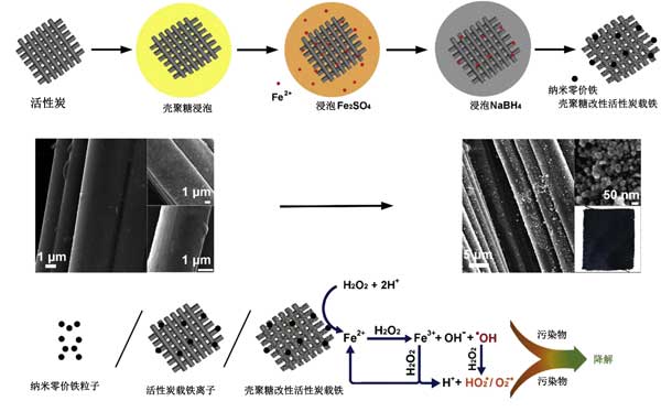 本次一共制備了三種類型的非均相Fenton催化劑,分別是納米零價(jià)鐵顆粒,活性炭負(fù)載的納米零價(jià)鐵和浸漬有納米零價(jià)鐵的殼聚糖改性活性炭。通過(guò)在活性炭上吸收鐵離子,然后使用NaBH 4原位還原,合成了活性炭負(fù)載的納米零價(jià)鐵。殼聚糖改性活性炭的制備方法是,先在酸洗過(guò)的活性炭上涂覆一層殼聚糖,然后將亞鐵離子螯合到殼聚糖基質(zhì)中,然后將其原位還原為納米零價(jià)鐵。這幾種活性炭催化劑的合成過(guò)程示意圖如圖1所示。