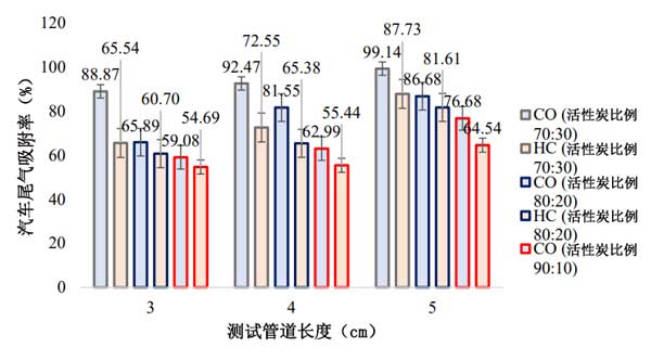 另外,隨著管的長度增加而增加,并導(dǎo)致活性炭的活性芯增加。吸附容量與活性炭的質(zhì)量成正比,因此可以吸收氣體的吸附劑分子也會增加。因此,吸附管中的長度變化對降低CO和HC濃度有影響。從圖3中可以看出,CO氣體的吸附百分比大于HC氣體的百分比。這是由于活性炭在CO和HC之間的吸附方式的變化;钚蕴课侥J绞芏喾N因素影響,包括活性炭分子在吸收污染物分子中的選擇性(親和力),溫度,壓力和氣體分子的大小。HC的分子結(jié)構(gòu)比CO更復(fù)雜。因此,HC的分子大小將比CO大。因此,活性炭吸附的HC小于活性炭吸附的CO。