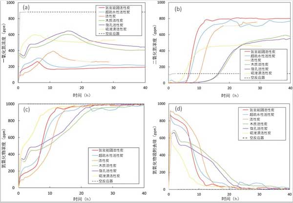 為了測試活性炭在環(huán)境溫度下對氧化和去除的催化和吸附性能。這些簡化的條件與實際煙氣條件大不相同,后者具有不同的成分和雜質,并且在不同的壓力和溫度下。但是,這些條件使我們能夠簡化復雜的系統(tǒng),以更好地了解NO氧化。圖中顯示了在干燥條件下,環(huán)境溫度和壓力下不同活性炭在NO氧化過程中NO,NO 2和氮氧化物的濃度分布圖。NO氧化轉化率與運行時間的關系也可以由NO濃度來計算的。還計算了每個給定時間的NO入口和氮氧化物出口濃度之間的差異,并顯示為通過吸附去除的氮氧化物量;測試代表在相同條件下通過使用無活性炭催化劑的空反應器進行的測試。穩(wěn)態(tài)NO轉化率,氮氧化物的累積量吸附,以及所需要的時間,以達到最大的NO濃度或吸附的突然釋放NO 2的出口流中還從濃度曲線中獲得了這些元素。