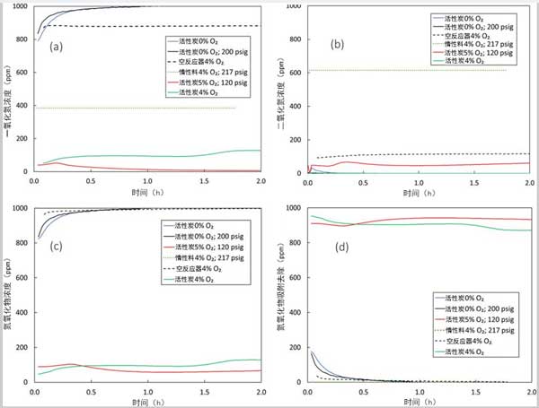 在大氣或高壓下沒有氧氣的情況下進行的基線活性炭測試中吸附的NO,NO 2,氮氧化物和氮氧化物的濃度曲線證實,即使在200 psig的高壓下也不會發(fā)生NO 2的形成或大量NO的吸附。在沒有氧氣的情況下,活性炭催化劑上沒有NO吸附。即使在200 psig下,NO也無法物理吸附在活性炭表面上,而且氧氣的存在也是必不可少的以促進NO在化學吸附的氧位點上的化學吸附。