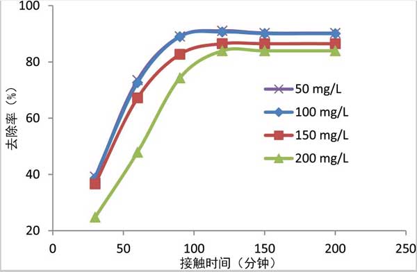 進(jìn)行了兩組實(shí)驗(yàn)以研究苯酚在活性炭負(fù)載納米銀吸附劑上的吸附。進(jìn)行了一組實(shí)驗(yàn)以研究苯酚的初始濃度和接觸時間對活性炭負(fù)載納米銀吸附劑對苯酚吸收的影響。這是通過改變初始濃度(50–200mg/L)和接觸時間(30–200min),同時分別將吸附劑量和攪拌固定在0.2g和200rpm上來實(shí)現(xiàn)的。另一組實(shí)驗(yàn),用來確定活性炭吸附劑的最大程度吸收苯酚的工藝參數(shù)。在這里,選擇的因素包括初始苯酚濃度,接觸時間,吸附劑劑量和攪拌速率等。
