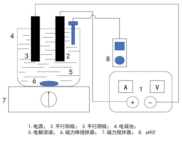 目前尚不知道電凝是否可以與活性炭吸附結合使用,作為從礦井廢水中去除硫酸鹽的可行新技術。所以我們來測試一下如圖1所示,使用有機玻璃反應器在720mL電凝電池(12×10×6cm)中進行活性炭吸附過程。鋁(純度≥99%)用作犧牲電極,不銹鋼用作陰極。每個電極板的有效面積為20cm2。平行的陽極和陰極垂直放置,并隔開一定距離。電極連接到數(shù)字直流電源,電壓和電流范圍分別為0-50V和0-5A。每次運行前,電極用細砂紙磨擦,先后用0.2M HCl和蒸餾水洗滌。對于每個實驗運行,將600mL礦井水放入電凝反應器中。使用磁力攪拌器不斷地(200rpm)攪拌溶液。將電流密度,電極間隙,初始pH和反應時間設置為期望值。通過添加0.1M HCl或0.1M NaOH來調節(jié)pH,并使用pH計進行測量。所有運行均在室溫(20°C)下進行。
