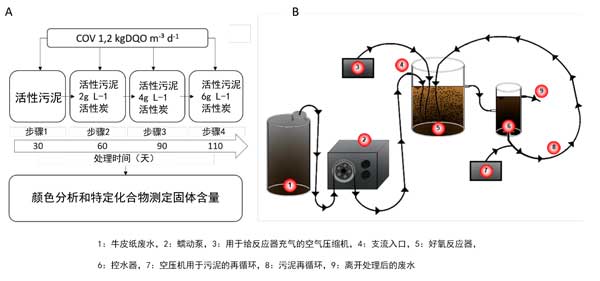 圖1:(A)實驗方法流程圖,(B)用粉狀活性炭活化的污泥系統(tǒng)。