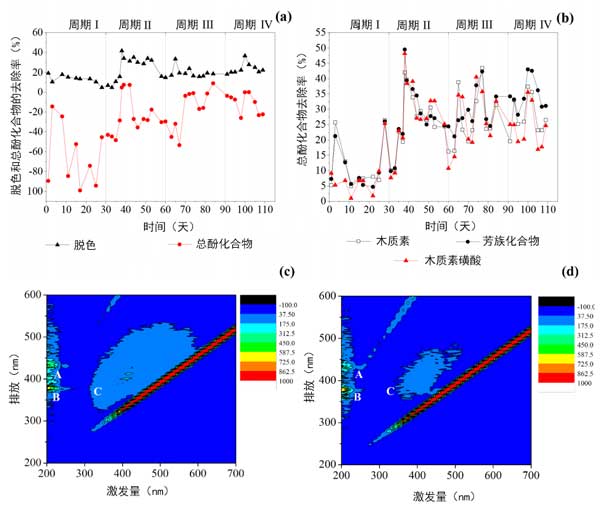 圖2:(a)去除顏色和總酚類化合物。(b)去除木質素,芳族化合物和木質素磺酸化合物。(c)富集的熒光發(fā)射和激發(fā)矩陣。(d)廢水排放和熒光激發(fā)矩陣。