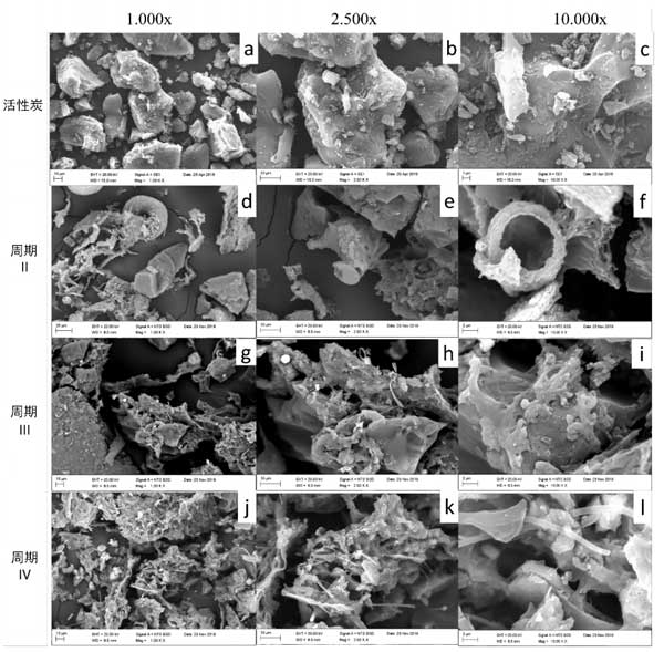 觀察圖3所示的圖像,處理期間生物量顯著增加,其中存在大量生物材料,可能的絲狀形成和微生物團聚,表明存在較大量步驟IV中的生物量。至于生物膜的發(fā)展,觀察顯微照片增加了10,000倍(圖3C,3I和3L),注意到附著在活性炭表面的微生物的生長。這些可能是細菌,真菌和絲狀細菌,活性炭在反應器運行110天后,固體樣品中的細菌含量更高。