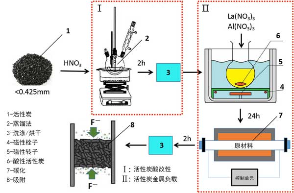 鑭鋁改性活性炭的制備包括兩個步驟:酸改性過程(I)和鑭-鋁加載過程(II)。方法I涉及特定質(zhì)量分數(shù)的硝酸(HNO3)。將HNO3和活性炭混合在燒瓶中,將燒瓶置于75°C的恒溫水浴中保持2小時。然后,將活性炭洗滌至中性并在100℃下干燥3小時,從而獲得酸改性的活性炭。用鑭(NO3)3·2H2O和鋁(NO3)3加載鑭和鋁的酸改性活性炭。將10g酸改性活性炭在100mL鑭(NO3)3·2H2O和鋁(NO3)3的混合溶液中攪拌24小時。然后,將固體產(chǎn)物在氮氣下于300°C的管式爐中碳化兩小時,冷卻至室溫后,完成鑭鋁改性活性炭,制備和吸附過程示意圖如圖1所示。鑭鋁改性活性炭將用作氟化物的吸附劑。