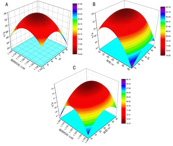 圖3:(A)吸附時間和pH在反應(yīng)表面上的相互作用。(B)pH和溶液在響應(yīng)表面上的相互作用。(C)吸附時間和溶液在反應(yīng)表面上的相互作用。