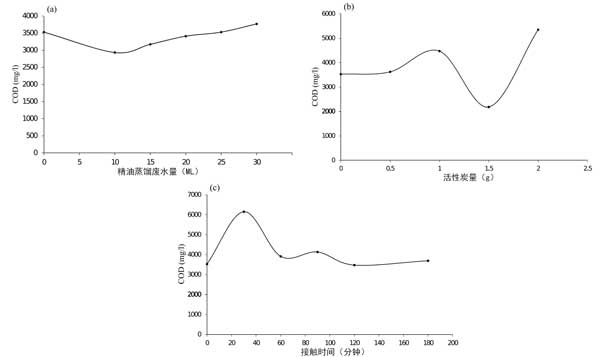 圖2:活性炭的參數(shù)對(duì)吸附COD含量的影響:(a)體積,(b)活性炭重量,(c)接觸時(shí)間。