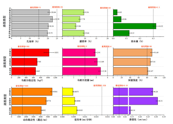圖2:活性炭和多孔瀝青的調(diào)節(jié)性能(空隙,磨耗,排水,馬歇爾穩(wěn)定性,馬歇爾流量,保留強(qiáng)度,動態(tài)穩(wěn)定性,變形率和滲透性)的比較。