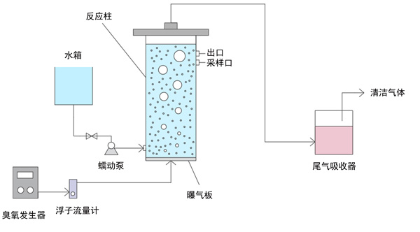 臭氧的反應(yīng)裝置如圖1所示。它主要由高硼硅酸鹽玻璃和臭氧發(fā)生器制成。反應(yīng)器高度為500mm,外徑和內(nèi)徑分別為70和65mm,有效容積為1.5L。反應(yīng)器中臭氧氣體的流量可控制在100mL分鐘以?xún)?nèi)。反應(yīng)器中的氣體分配器是鈦板,其孔隙率約為20%至30%,微孔的平均孔徑約為17μm。臭氧反應(yīng)尾氣的吸收溶液為濃度為1.5mol/L。對(duì)色度為600的模擬水楊酸異羥肟酸廢水500mL進(jìn)行采樣,并將其放入燒杯中。將制得的活性炭量0.03、0.06、0.09、0.12、0.15和0.18g/L樣品分別添加到前一溶液中,然后用磁力攪拌器混合以達(dá)到吸附平衡,分析處理后的上清液的色度以評(píng)價(jià)處理效果。