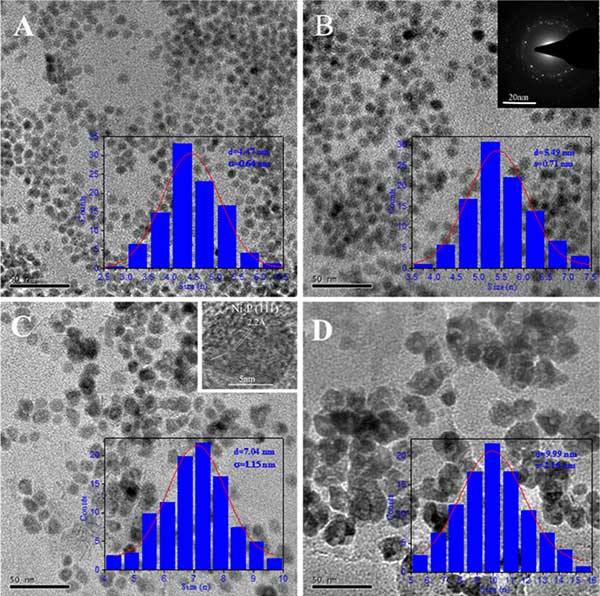 活性炭中鎳的透射電子顯微照片(圖1的A-d),納米粒子為球形且均勻地分布,這表明金屬磷化物納米顆粒的相對尺寸和分散度的化學反應過程中合成。在催化劑合成過程中,油胺起還原劑的作用,從而控制成核速率。同時,三辛基膦用作磷源和穩(wěn)定劑,通過Ni(0)表面的配位提供可調(diào)的表面穩(wěn)定性。在合成中,對于少量三辛基膦,發(fā)生Ni(II)前體的快速還原,導致Ni(0)物質(zhì)的重要濃度,其不能被溶液中存在的配體有效穩(wěn)定。然后,快速聚集過程的結(jié)果形成大尺寸的磷化鎳納米顆粒在活性炭載鎳催化劑。然而,當油胺的量減少時,制備少量核,并且大量三辛基膦的存在抑制它們的生長,導致形成小的納米顆粒。此外,所選擇的區(qū)域的電子衍射和晶格條紋的圖像(在所示圖1 B,C)表明,球形磷化鎳納米粒是單晶。因此,它的尺寸大于Ni 2通過改變油胺和三辛基膦的濃度可以很容易地調(diào)節(jié)活性炭催化劑,這提供了一種精確控制其尺寸在4到10nm范圍內(nèi)的方法,在這些方法中,這些磷化鎳納米顆粒在活性炭上以各種尺寸負載將具有不同的屬性可能導致不同的反應性。