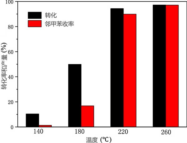 為了評價制備的磷化鎳活性炭的有用性,進行對生物油模型化合物加氫脫氧的活性。在測試中,我們使用SA(水楊醛)作為熱解油的代表性組分來探索加氫脫氧途徑。在這項工作中,SA轉(zhuǎn)化為鄰甲酚可以通過路徑氫化/氫解或C=O鍵的直接氫解進行。圖2顯示了加氫脫氧相對于鎳的轉(zhuǎn)化率和產(chǎn)率活性炭受反應溫度影響。結(jié)果表明,隨著反應溫度的升高,SA的轉(zhuǎn)化率和鄰甲酚的收率逐漸增加。當反應溫度為260℃時,鄰甲酚目標產(chǎn)物的產(chǎn)率較大,2小時達到97.1%,這表明反應溫度顯著提高了它的區(qū)域選擇性加氫脫氧的催化活性。