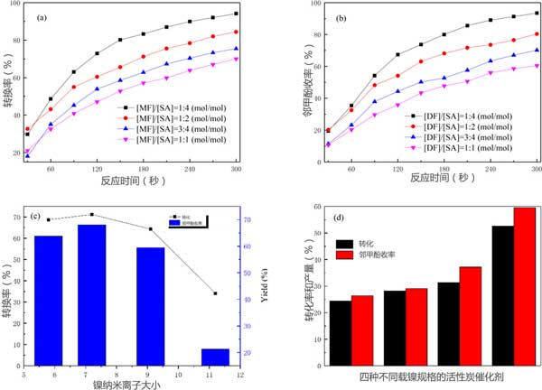 為了研究磷化鎳尺寸對活性炭催化性能的影響,SA的加氫脫氧在220℃和2MPa氫氣壓力下進行。在催化活性的顯著差異可以為鎳中觀察到活性炭變化的尺寸。隨著磷化鎳納米顆粒的減少,轉(zhuǎn)化率先增加然后減少。其中,活性炭在加氫脫氧反應中表現(xiàn)出更高的反應性,在180分鐘內(nèi)SA的轉(zhuǎn)化率達到99%以上,對鄰甲酚的收率超過97%。較小的鎳微晶表現(xiàn)出更強的Ni-P相互作用和磷在表面上的額外暴露,這顯著影響中間體的吸附狀態(tài),其中磷化鎳與反應物之間的相互作用既不太弱也不太強。因此,可以通過使用不同納米顆粒尺寸的磷化鎳來控制SA的加氫脫氧活性。
