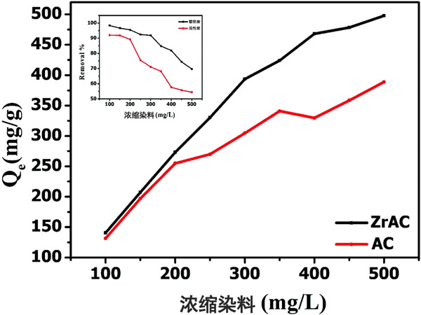 吸附等溫線 已經(jīng)進行了初步的批處理實驗,以研究新制備的載鋯活性炭的性能并確定其在廢水處理中的可行性。使用活性炭和載鋯活性炭的染料吸附如圖3所示。該圖顯示,隨著濃度從100 mg L -1增加到500 mg L -1,載鋯活性炭對活性藍19染料的去除效率更高。同樣,載鋯活性炭的吸附容量也顯示出比活性炭大吸附容量。載鋯活性炭的去除效率和吸附能力的提高主要歸因于較高的氧化功能,該功能很容易從溶液中吸收染料分子。