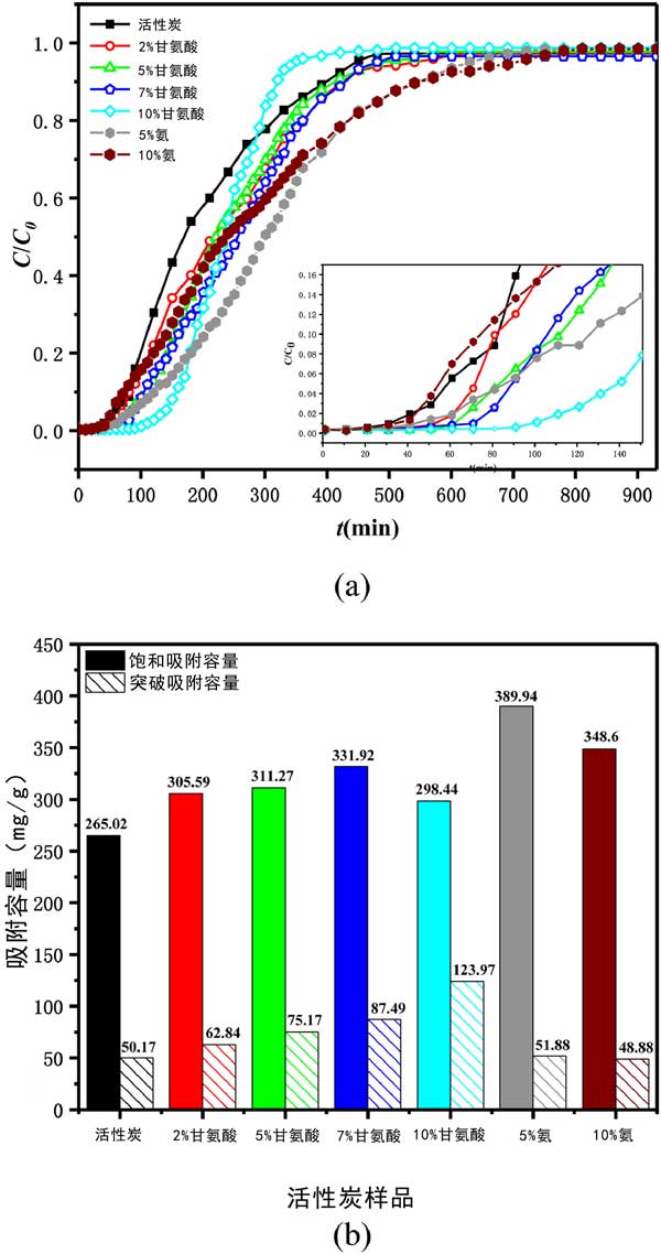 測試了選定的甲苯VOC對活性炭的吸附性能。在每個實驗運行中,甲苯通過裝有活性炭的吸附管直到達到平衡,即活性炭吸附劑被甲苯飽和。圖2(a)所示的穿透曲線呈現(xiàn)為甲苯吸附量吸附(ç/ç0)與接觸時間(噸,分鐘)六種的活性炭正在進行中,它們的飽和和突破吸附容量如圖2所示(b)。從吸附曲線可以看出,甘氨酸修飾的活性炭的穿透時間明顯延長,而飽和氨改性活性炭的時間延長。活性炭上甲苯穿透吸附能力的順序為10%甘氨酸改性活性炭>7%>5%>2%>5%氨改性活性炭>未改性活性炭>10%氨改性活性炭,而活性炭對甲苯飽和吸附容量的順序如下:5%氨改性>10%>7%甘氨酸改性>5%>2%>10%>未改性活性炭。可見甘氨酸修飾對甲苯吸附有顯著的正向影響。與原來的AC相比,甘氨酸改性的活性炭對甲苯的突破吸附能力分別提高了25%、50%、74%和147%,隨著甘氨酸濃度的增加呈上升趨勢。同時,甘氨酸改性的活性炭對甲苯的飽和吸附容量分別增加了15%、17%、25%和13%,且隨著甘氨酸濃度的增加先增加后減少。5%和10%的氨改性也提高了甲苯的吸附性能,但其優(yōu)勢主要體現(xiàn)在飽和吸附容量上,與原來的活性炭相比,分別提高了47%和32%。