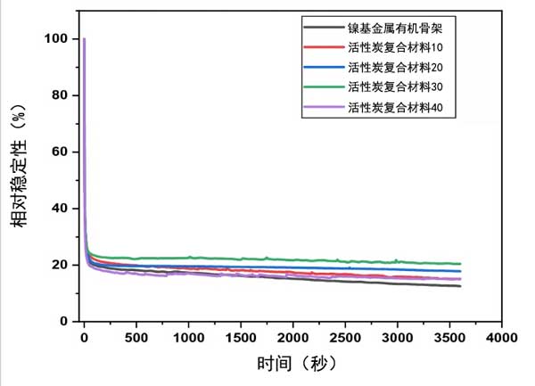 圖3:金屬框架及其復(fù)合活性炭在KOH和甲醇中的相對(duì)穩(wěn)定性曲線。