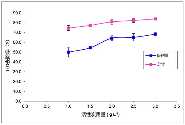 圖2顯示了在25℃、pH=7.5和170rpm的攪拌速率下,不同活性炭用量對COD去除的影響,持續(xù)24小時。我們測試了1.0、1.5、2.0、2.5和3.0g活性炭以確定合適吸附劑劑量。隨著活性炭濃度從1g增加到3g,觀察到COD去除率從50.0±5.1%和74.5±2.6%逐漸增加到吸附和總量的68.3±1.9%和83.9±1.0%。COD濃度從280.0±28.3略微下降至177.5±10.6mg。許多研究都報告說,隨著活性炭用量的增加,有機(jī)材料的去除率也會增加,這可以通過總比表面積和吸附劑上的活性位點來解釋。