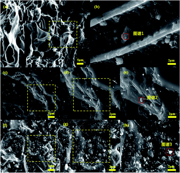 活性炭和鋅鹽失活催化劑的SEM圖像在圖2顯示。從圖2a和b可以看出,載銅活性炭催化劑具有良好的孔結(jié)構(gòu),不同尺寸的金屬氧化物顆粒分布在催化劑表面。放大5000倍后(圖2b),有利于反應(yīng)氣體吸附的孔結(jié)構(gòu)仍清晰可見。圖2c-e顯示ZnCl2-活性炭催化劑的大部分表壁坍塌,孔結(jié)構(gòu)嚴(yán)重受損,表明ZnCl2摻雜后活性炭結(jié)構(gòu)強度降低。圖2f-h表明ZnSO4-活性炭催化劑基體受到一定程度的破壞,表面粗糙,孔隙結(jié)構(gòu)幾乎看不到,僅在某些位置附著較大的金屬氧化物顆粒,局部堆積。這種團聚現(xiàn)象發(fā)生在ZnSO4摻雜后的催化劑表面,不利于CO和NO氣體的吸附,導(dǎo)致脫硝活性下降。