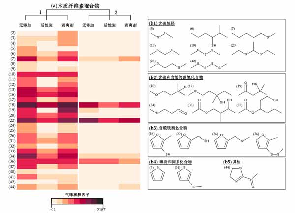 圖2:(a)在未處理和處理過的兩種木質素混合物中檢測到的含硫氣味劑氣味稀釋因子的彩色差異和(b1-b5)硫氣味劑的結構式根據其化學結構分為亞組數(shù)字(2-44)是指氣味的連續(xù)順序。