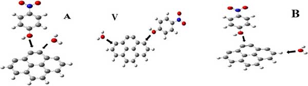 如上所述,為了啟動(dòng)對(duì)復(fù)合物優(yōu)化結(jié)構(gòu)的系統(tǒng)搜索,硝基苯酚和水分子均以選定的方向放置在距活性炭表面3Å的位置,覆蓋主體周圍的整個(gè)物理空間。兩個(gè)分子被設(shè)計(jì)為從不同的相對(duì)方向相互接近:(1)兩者都從本體的同一側(cè)進(jìn)行攻擊(A-初始構(gòu)型),(2)攻擊來自本體的相對(duì)側(cè)(V-初始構(gòu)型),(3)兩個(gè)分子遵循垂直路徑(B-初始構(gòu)型)。這三種方法如圖2所示。選定的初始構(gòu)型AB區(qū)分通過化學(xué)吸附或通過物理吸附連接的復(fù)雜結(jié)構(gòu)的形成。配置A有利于物理吸附,而配置V和B分別有利于完全和部分化學(xué)吸附。