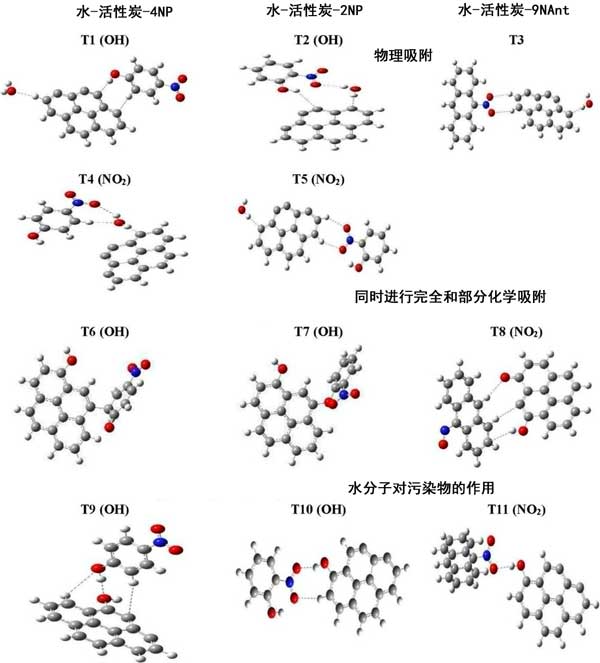 圖1:污染物和水與活性炭連接形成兩個(gè)分子聚集體的優(yōu)化結(jié)構(gòu)。