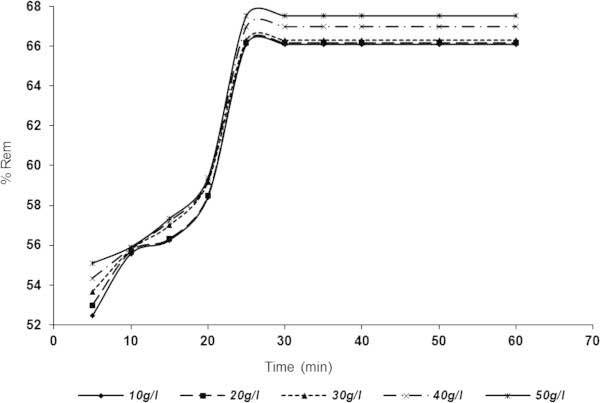 用于吸附除去SDP的相對于時間和吸附劑劑量的結果示于圖2,3在10-50克/升的范圍內。圖 5和6表明,SDP去除與在吸附劑用量增加而增加。從圖中可以看出,對于活性炭1(圖2)和活性炭2(圖 3),平衡時間為30分鐘后,顆粒截留迅速增加并趨于恒定 。從圖 5中,活性炭1在10g / l時的去除百分數分別為5和30-60分鐘時的60.5978和69.8369%。對于活性炭1(圖 2),分別以50g / l,63.3152和74.1168%記錄5分鐘和(30-60)分鐘。在圖3(活性炭2)中描繪了類似的趨勢, 其中在10g / l劑量下分別在5分鐘和(30-60分鐘)達到52.4456和66.1005%。對于50g / l 活性炭2劑量,分別在2和(30-60)分鐘時達到55.095和67.527%的去除率。結果表明,活性炭1在本實驗條件下表現(xiàn)優(yōu)于活性炭2。