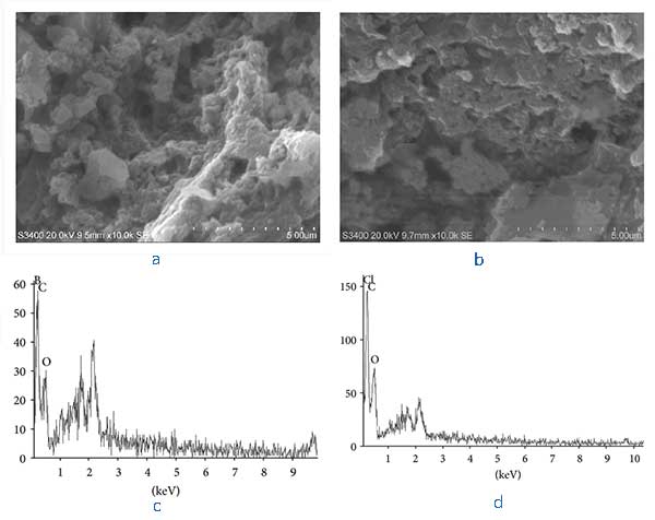 圖3:(a)活性炭負(fù)載鋯和(b)氟化物吸附的活性炭負(fù)載鋯的SEM圖像,以及(c)活性炭負(fù)載鋯和(d)氟化物吸附的負(fù)載鋯的EDAX譜圖。
