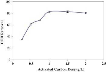 吸附劑劑量在廢水后處理吸附過程中起著重要的作用;钚蕴縿┝繌0.25到 2g / L的變化進(jìn)行了幾個(gè)實(shí)驗(yàn)。圖2顯示了對(duì)活性炭劑量的吸附容量(q)。 隨著吸附劑用量增加到0.75g / L,COD的殘留量從470mg / L 降至51mg / L,超過了COD的輕微下降。通過將吸附劑(GAC)的劑量增加到 2g / L,類似物COD去除百分比從34.8%增加到81%。因此, 從經(jīng)濟(jì)角度來看,最佳的活性炭劑量是0.75g / L。