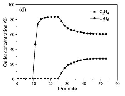 吸附行為通過(guò)吸附突破測(cè)試來(lái)確認(rèn)。裝載17.44g 36.7%活性炭吸附劑樣品,柱孔隙率為0.56。進(jìn)料氣體是乙烯/乙烷/氮?dú)?28:60:12)的混合物,流速為40 mL / min。測(cè)量在0.1MPa和25℃下進(jìn)行。