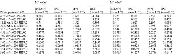 為了進一步闡明聚乙烯亞胺浸漬量對活性炭上金屬離子平衡吸附容量的影響,本文計算和比較了PEI浸漬AC上重金屬離子吸附的相互作用參數(shù)(表示為PEI)。應該指出的是,I PEI不等于絡合常數(shù),只計算比較重金屬和PEI浸漬的活性炭表面之間的相互作用程度。