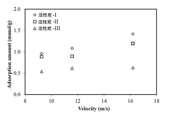 間歇填充床試驗(yàn)中,活性炭對(duì)于甲苯蒸氣的吸附容量,即最大容許吸附量,從各種尺寸的活性炭的等溫實(shí)驗(yàn)中發(fā)現(xiàn)為0.01-0.03mol / g。第一次施加到以16.2米/秒運(yùn)行的旋風(fēng)分離器的新鮮吸附劑的吸附量對(duì)于活性炭-I是1.4mmol / g,對(duì)于活性炭-II是1.2mol / g和對(duì)于活性炭-III,如圖2所示。它僅僅小于活性炭吸附劑潛在容量的1/10。該旋風(fēng)分離器中甲苯的吸附量與交流流化床反應(yīng)器的體積(3.3〜5.4mmol / g 活性炭)相當(dāng)競(jìng)爭(zhēng)。至于尺寸效應(yīng),小顆粒提供大單位體積的表面積,這可以呈現(xiàn)更多潛在的吸附位點(diǎn)。對(duì)于活性炭-I、II、III,各尺寸范圍的面積分別為1145,1034和912m2/ g。