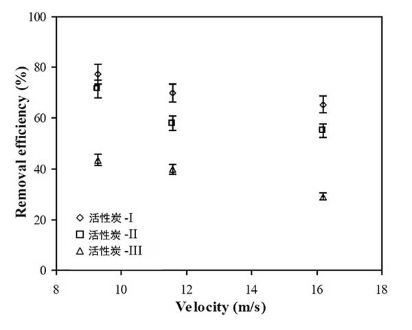 流速同時(shí)影響氣體吸附和活性炭回收,因?yàn)樗婕皻怏w和活性炭顆粒的混合程度、。圖3在各種活性炭吸附劑尺寸下,氣體去除效率和流量之間呈現(xiàn)出輕微的反比關(guān)系。最小的吸附劑(活性炭-1)以9.26米/秒除去77.4%的甲苯蒸氣,然后以16.2米/秒降至65.4%。微;钚蕴课絼┎东@沿著旋風(fēng)分離器的流動(dòng)路徑行進(jìn)的甲苯蒸氣。雖然在前面的的內(nèi)容說(shuō)過(guò)吸附量以高速增加,但是氣體去除效率相當(dāng)?shù)汀_@是因?yàn)樵诟吡髁肯录妆降慕^對(duì)體積要高得多。因此,即使活性炭吸附得更多,更多的氣體分子傾向于流出而沒(méi)有在內(nèi)部吸收。因此,關(guān)于顆粒回收和氣體去除效率的最佳流量必須通過(guò)在各種操作條件下的眾多實(shí)驗(yàn)來(lái)確定。