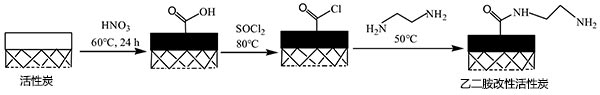 步驟一:乙二胺合成改性活性炭,用去離子水洗滌活性炭并干燥,得到10.0g活性炭,將其加入250mL含有150mL硝酸溶液的燒杯中。將反應(yīng)混合物在60℃下攪拌24小時(shí)。然后用去離子水洗滌產(chǎn)物以中和并在105℃的真空烘箱中干燥以獲得經(jīng)硝酸處理的活性炭。然后將2.0g處理后的活性炭和5mL SOCl 2加入燒瓶中。將反應(yīng)混合物在80℃下加熱12小時(shí)。反應(yīng)后,將混合物加熱至130℃以蒸發(fā)殘留的SOCl 2并冷卻至室溫(25℃)。將產(chǎn)物加入100mL DMF中,溶解5mL EDA并在50℃反應(yīng)8小時(shí)。冷卻至室溫后,分別用去離子水,DMF和無水乙醇洗滌產(chǎn)物數(shù)次,然后在105℃的真空烘箱中干燥,得到改性活性炭。合成過程在圖1中說明。