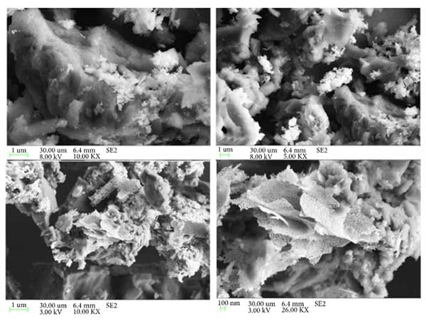 掃描電子顯微鏡分析:SEM研究證實了氧化鋅在活性炭載體上的負載,圖1示出了活性炭的SEM圖像。可以看出,活性炭呈細孔的不規(guī)則圖案。另外,氧化鋅顆粒沉積在活性炭的表面和孔中。仔細觀察表明活性炭表面上的片狀氧化鋅結(jié)構(gòu)。